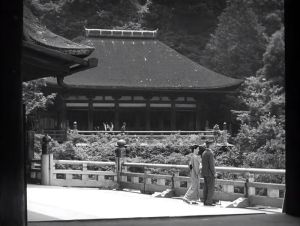 Printemps tardif, Yasujirô Ozu 1949 Banshun Shochiku (1)_saveur 23 novembre 202019 décembre 2025limguela surcadrage, deux personnages debout côte à côte en plan d’ensemble, rampe, regarder au loin