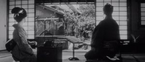 Samouraï, Kihachi Okamoto 1965 Mifune Productions Co. Ltd., Toho Company (5)_saveur 28 décembre 202030 septembre 2025limguela porte coulissante, jardin, livre, théière, chignon, deux personnages assis de dos, tatami et washitsu,