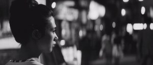 nuque, chignon, lumières dans la nuit, ruelle, longue focale, personnage de dos en plan rapproché second plan flou, tête tournée