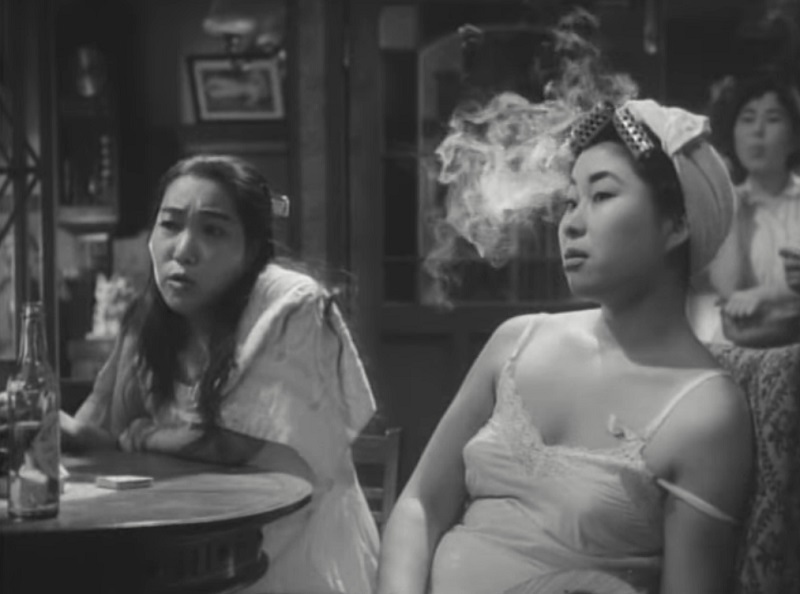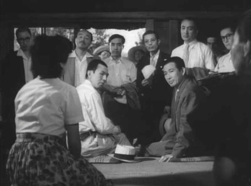 Étrange cette ressemblance avec les histoires de Seicho Matsumoto (Kiri no hata, Le Vase de sable, etc.) avec des séquences d’enquêtes en province qui semblent sortir déjà des adaptations de Yoshitarô Nomura… Le film est de 56, la première histoire adaptée d’un roman de Matsumoto viendra l’année suivante, et dès 58, Shinobu Hashimoto et Yoshitarô Nomura proposeront une adaptation d’un de ces romans : Harikomi… Le film, tiré d’un romancier moins prolifique pour le cinéma, a peut-être marqué le romancier… Quoi qu’il en soit, c’est un domaine où Imai n’est pas du tout à l’aise parce qu’on s’y fait royalement suer. Plus à l’aise dans le drame ou le mélo. Voire dans le mélo avec une pincée de crime tragique (Shinobu Hashimoto et Kaneto Shindô lui écriront l’adaptation de Yoru no tsuzumi.) Ça annonce peut-être en tout cas un basculement des films japonais vers les films criminels qui ont si bien marqué la décennie suivante, et une disparition progressive des drames réalistes et sociaux et des mélos à la Imai.