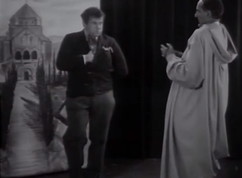 Le film de Protazanov fourmille déjà d’inventions : récit en flash-back d’une histoire qui ne s’est en fait pas du tout passée comme le conteur le prétend (l’humour naissant de l’opposition des deux) ou mise en abîme (savoureuse séquence où on projette des rushs du film « la fête de Saint Jorgen » avec un saint censé marcher sur l’eau, mais personne ne peut y croire et une scène malencontreusement interrompue par un canot entrant dans le champ avec un « saint » Jorgen s’emportant face aux intrus…).