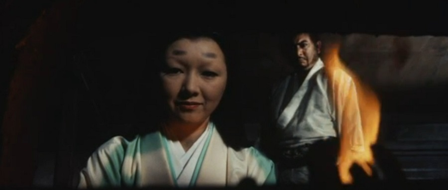 Misumi assure parfaitement sa partition. Il ralentit le rythme et s’abstrait de tout réalisme dans sa direction d’acteur, comme à son habitude. La première séquence donne le ton : si on a vu le goût du metteur en scène pour les gestes lents et précis, ici, on frôle la lenteur pesante et l’hiératisme hypnotisant (on n’est pas loin de ce que proposera bientôt Kubrick dans Barry Lyndon). On songe peut-être au début de L’Intendant Sansho ou à Rashômon (deux films sur lesquels Kazuo Miyagawa a travaillé), à la lenteur encore de certaines séquences du Guépard, ou à celle de Tarkovski sur L’Enfance d’Ivan et Andreï Roublev. Pour les références japonaises et la lenteur (ainsi que le goût pour le huis clos), je ne peux qu’évoquer Yoru no tsuzumi, la couleur en moins, les films de Shirô Toyoda, et puis surtout des films de la nouvelle vague beaucoup plus propices à ce genre d’expérimentations comme L’Île nue (les dialogues en moins et le traitement du temps complètement différent ; quelques séquences d’Onibaba jouent aussi parfaitement sur la lenteur), Fleur pâle (et sans aller vers la lenteur, la recherche formelle et l’incommunicabilité de Yoshida), L’Approche de l’ombre de la nuit ou Kwaidan.