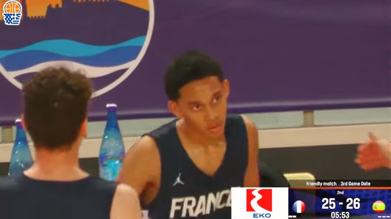 À nouveau surclassé (d’un an, cette fois), le meneur de poches (il fait les poches des adversaires pour leur voler des ballons) commence timidement le tournoi du haut désormais de son mètre 76. Lors du 1/8 de finale face à la Croatie, le coach le fait débuter sur le banc, et cela ne se passe pas comme espéré puisque le ouistiti est obligé de venir écoper très vite la faiblesse de ses aînés. Fautes provoquées, organisation dynamique du jeu, partage du ballon, et surtout ballons volés, voilà un joli apport. Il finit ce match avec un ± de 35 et une évaluation de 25 dont 10 passes et 7 ballons volés pour seulement un ballon perdu. Déjà un organisateur, un passeur, un driver et un défenseur élite. Il est certes plus petit que ses adversaires, mais il est bien costaud : plus que sa taille, ce serait intéressant de connaître son poids. Surtout par rapport à des meneurs de petites tailles à l’âge adulte. Notamment en défense ou sur pénétration, il arrive à bumper et à jouer des épaules ou de son buste pour repousser l’adversaire ou se faire de la place. Je ne serais pas étonné si Cholet l’envoie directement chez les pros dès ses 16 ans. Taille patron.