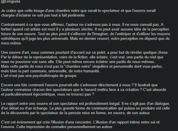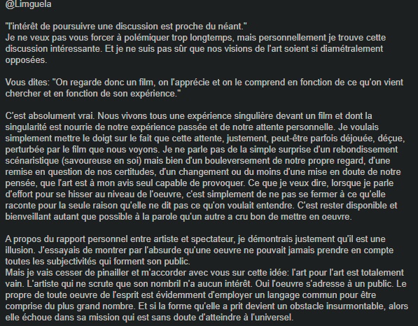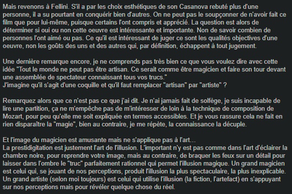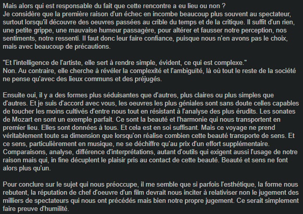 L’image de la lumière dans la chambre noire est pertinente quand on la conçoit comme je conçois l’art. Manifestement, on en a une vision totalement différente. Il faut respecter ça, je vais encore faire appel au relativisme. Vous vous intéressez à l’art et vous avez des valeurs, et tout cela vous est propre. On regarde donc un film, on l’apprécie et on le comprend en fonction de ce qu’on vient chercher et en fonction de son expérience. Mon expérience, ma formation, mes valeurs, mon goût, je l’ai grâce à ma formation théâtrale. Vous en aurez sans doute une autre. Et il m’est arrivé de tâter un peu d’écriture, et on retrouve exactement les mêmes principes, les mêmes techniques, et les mêmes objectifs. Un acteur s’adresse bien à un public. On trouve certes des acteurs qui ne jouent que pour eux-mêmes. Ce sont les pires. On trouve aussi des écrivains qui n’écrivent que pour eux-mêmes, c’est même 99 % des écrivains, ceux qui ne vont pas publier et dont les écrits n’intéressent qu’eux-mêmes. Un acteur, comme un cinéaste ou un écrivain ne va pas s’adresser individuellement à chaque spectateur de la salle. On s’adresse à un public. Une œuvre, c’est un produit relayé par un transmetteur à une audience. C’est ainsi que ça a toujours fonctionné, et cela dans tous les arts. C’est donc un peu idiot de ramener ça à un rapport entre l’artiste et un spectateur. Vous pouvez la faire, mais ce serait la preuve de votre grande méconnaissance en matière de production. Tout le monde ne peut pas être artisan. Ce serait comme être magicien et faire son tour devant une assemblée de spectateurs connaissant tous vos trucs. À partir de là, notre compréhension du “phénomène” étant parfaitement opposée, l’intérêt de poursuivre une discussion est proche du néant.