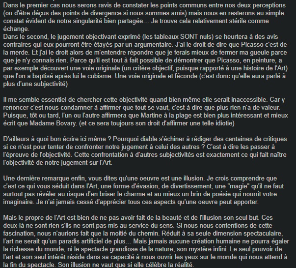 Rendre objectif ce qui est une expérience personnelle, c’est intéressant pour qu’on puisse comprendre chacun d’entre nous ce qui est au centre de nos propres préoccupations, intérêts, etc. C’est même une des dimensions les plus intéressantes dans l’art. Mais en aucun cas, on ne saurait parvenir à créer des critères de jugement objectifs valables pour tout le monde. Et c’est même en ça d’ailleurs que l’art est si vital pour l’homme. Parce que face à une œuvre, personne ne pourra nous imposer des critères objectifs. On aime, on adhère, on y trouve de l’intérêt, et personne ne pourra jamais être en mesure de nous dire qu’on a tort. En matière d’art, il n’y a ni raison ni vérité. Seule la liberté de percevoir, d’aimer, de comprendre, avec comme seul critère de jugement : nous-mêmes.