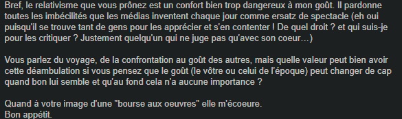 Quand on juge une œuvre mauvaise, il faut un sacré toupet pour estimer que cela incombe au spectateur. Si on ne te comprend pas, si on ne te prête aucune attention, si tu ne convaincs pas, ce n’est pas la faute de l’autre, du spectateur, mais bien à l’artiste. Et puis quoi encore ? Tu vas courir les castings, tu envoies des manuscrits à des éditeurs, on te trouve nul, et… c’est la faute de ceux qui te voient ou qui te lisent ? Heu, non. En tout cas pas dans ma perception. Vous en avez une autre, c’est tout à fait votre droit.