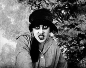 Musidora dans Les Vampires, Louis Feuillade (1915) personnage de face en plan rapproché, regard caméra, montre