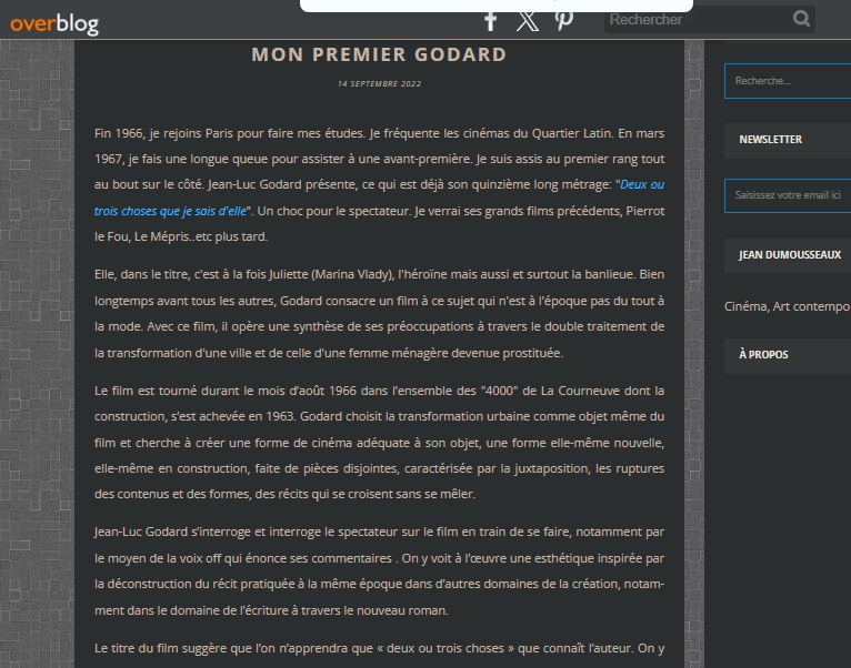 Dernière entrée de blog : 2022, avec un article intitulé « Mon premier Godard » sur Deux ou trois choses que je sais d’elle, de Jean-Luc Godard.