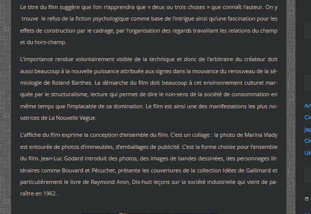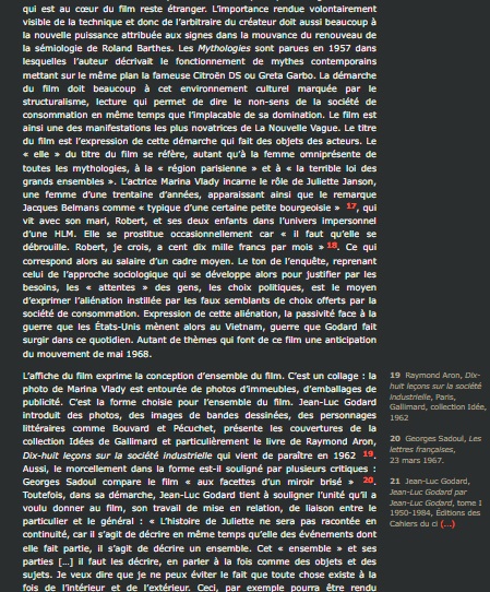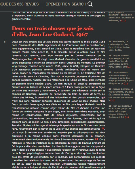 Le logiciel pointe d’abord sur une page d’un texte écrit par Aurélie Cardin et partagé sur journals.openedition.org intitulé Les 4000 Logements de La Courneuve : réalités et imaginaires cinématographiques à travers Deux ou trois choses que je sais d’elle (1967) de Jean-Luc Godard.
