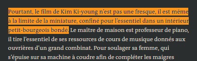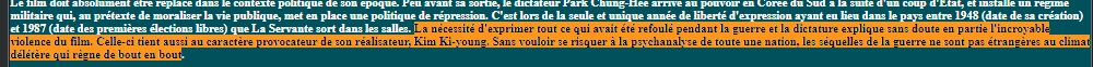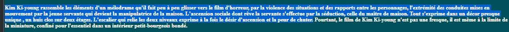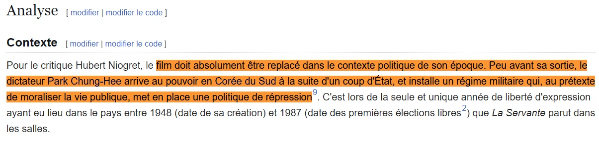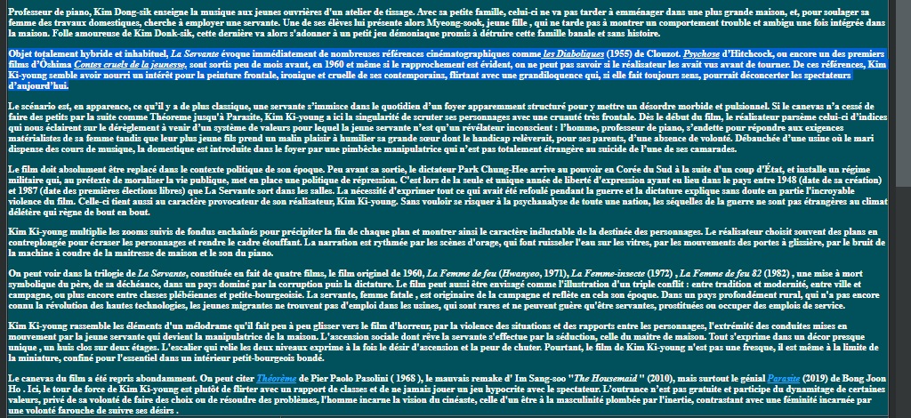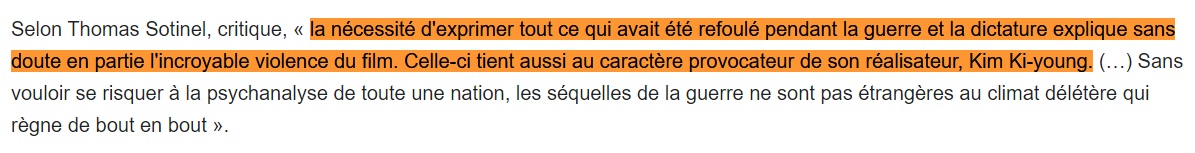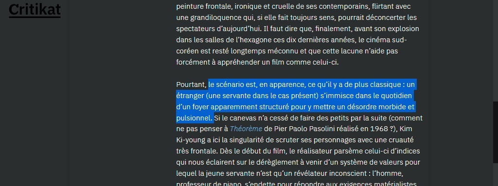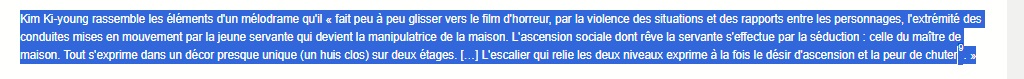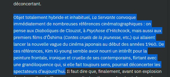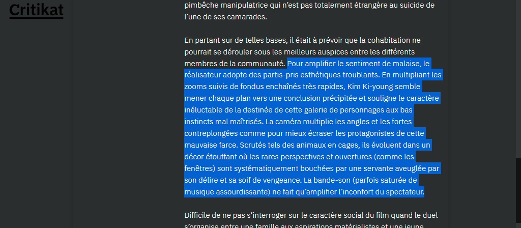 Je vais sur une page qui vérifie automatiquement le plagiat (https://www.paraphraser.io/fr/logiciel-anti-plagiat). Et là, premier paragraphe : trois sources différentes suggérées. Je regarde les sources. Wikipédia, TMDb et Le Printemps coréen, un site reprenant lui-même les éléments de Wikipédia citant des sources bien réelles : ici, Hubert Niogret, de Positif, Thomas Sotinel, du Monde. Des emprunts supplémentaires plus importants à ces deux journaux viennent à partir du quatrième paragraphe.