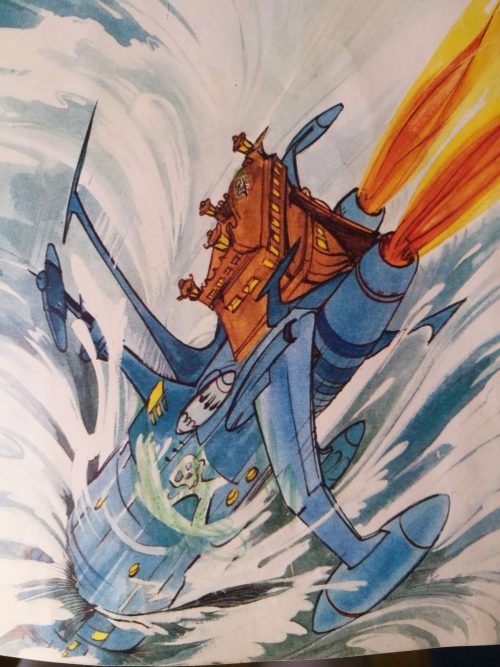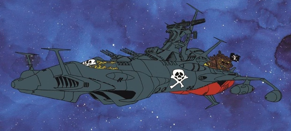 Je m’amusais à noter dans ma réponse sur Twitter que dans les réponses données, l’Arcadia revenait souvent, mais dans une tout autre version que je trouve plus agressive et donc moins à mon goût : celle avec la tête de mort sur le devant. La forme du vaisseau est beaucoup moins originale que les deux précédents de ma liste, et si Albator lorgne largement sur la grande époque de la piraterie en mer, son vaisseau fait plus volontiers référence aux bâtiments de la marine du XXᵉ siècle. Ici, c’est un mélange de cuirassier et d’avion, avec plus qu’un ou deux éléments rappelant les vaisseaux pirates classiques. Mais ce qui est le plus remarquable pour moi, c’est qu’on est ici en plein dans la projection masculine, voire dans la construction typique d’une masculinité passant par l’objet. L’objet étant… son phallus. Celui-ci ne se transforme pas (encore), mais il est puissant, longiligne et tire des missiles (…). Et donc, ce qui m’amuse bien le plus, c’est de voir à quel point la version avec la tête de mort sur le devant ressemble encore plus à un pénis gorgé de testostérone assez peu avenant, et que cette version, en forme de tête de requin, plus effilée (avec un “l”, je dis ça pour les lacanistes), plus que ressemblante à un pénis ferait, étrangement, plus penser à un godemichet affublé de ses petits stimulateurs clitoridiens sur le devant (on voit même en son centre combien la prise en main est idéale…).