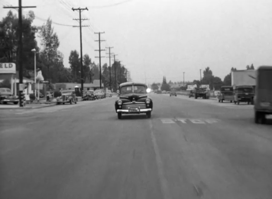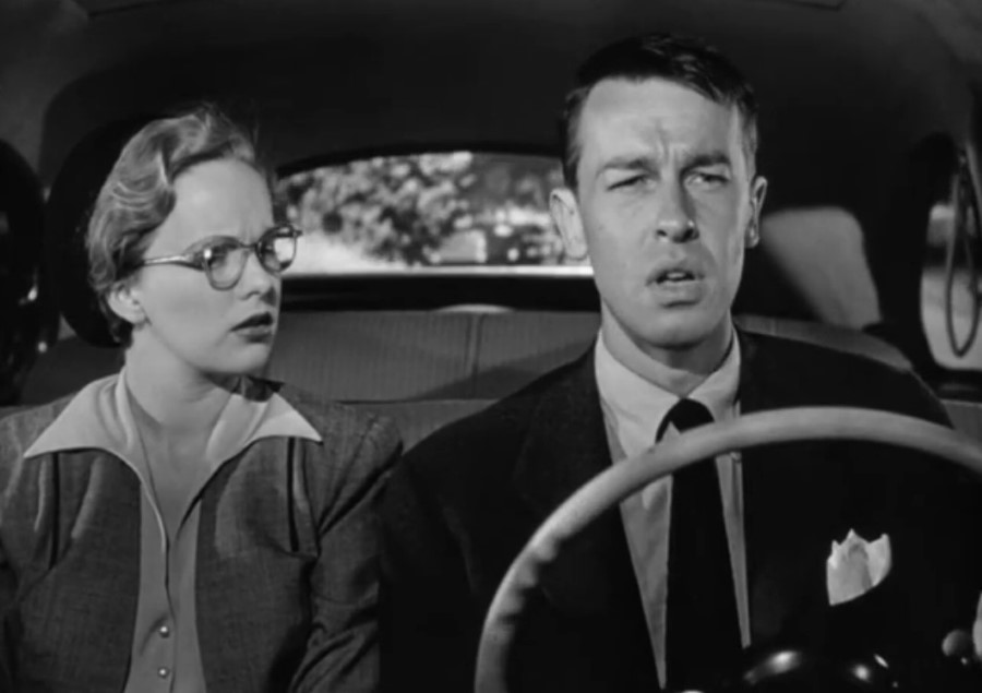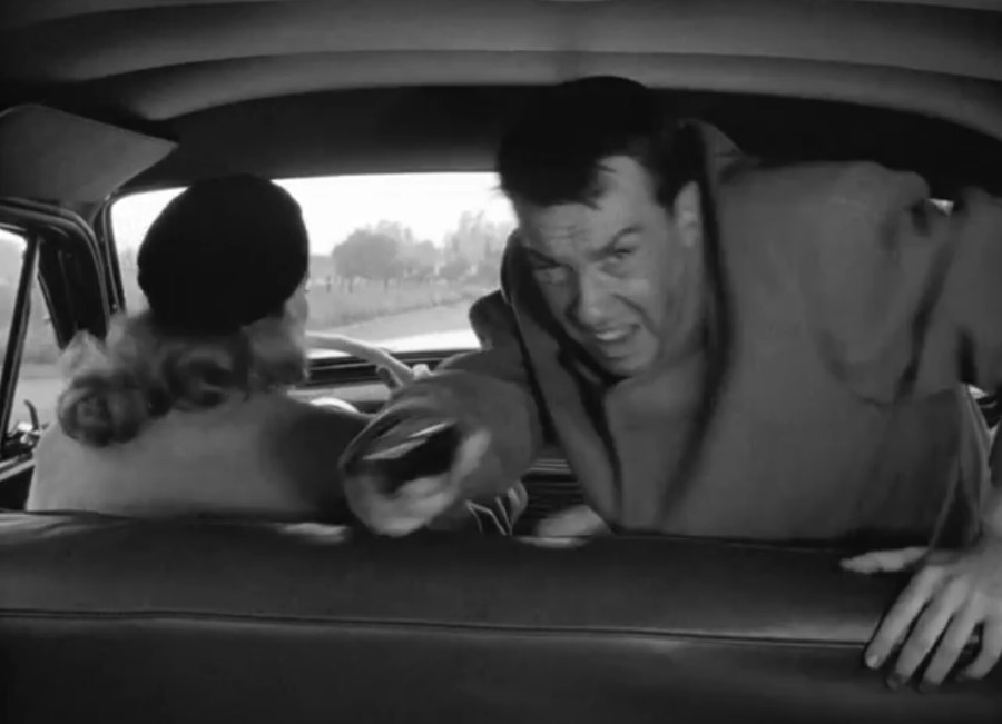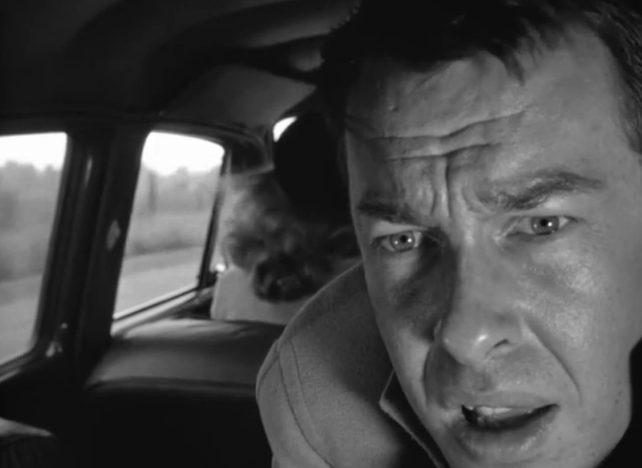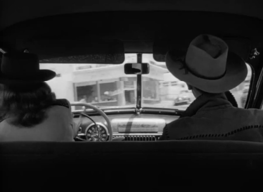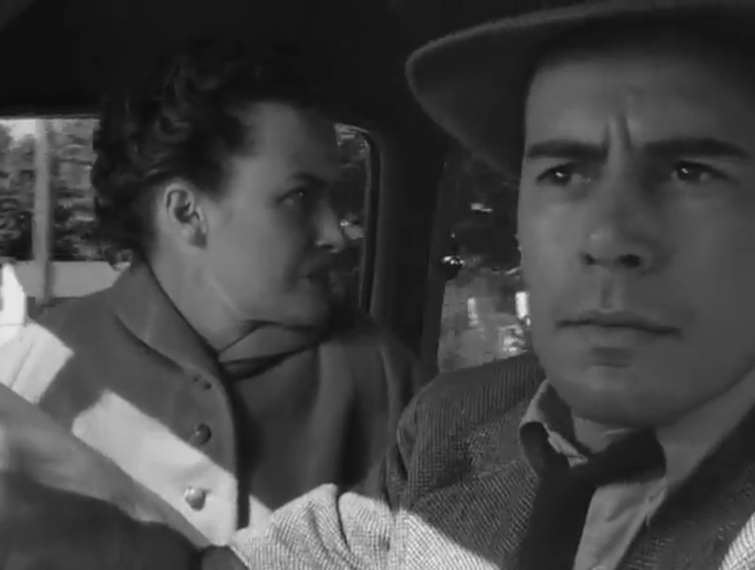 La même année que Sur les quais, Herbert J. Biberman, n’a pas les moyens des grands studios pour réaliser Le Sel de la terre. Ni les moyens de se payer des séquences de transparence en studio, encore moins d’imaginer des dispositifs mobiles à la Gun Crazy. Biberman a donc une solution toute trouvée pour résoudre le problème : il y aura bien des séquences prenant place dans une voiture, mais celle-ci sera arrêtée. On touche au naturalisme social et l’automobile fait même figure d’attribut symbolique du propriétaire face à ceux qui n’ont rien. Tourné hors des grandes villes, Biberman n’a aucun souci pour contrôler tous les aspects visuels de ses plans pour la plupart tournés « on location ». Rien pour autant de statique dans ces séquences : à l’image du personnage de Edward G. Robinson dans Les Dix commandements supervisant depuis sa chaise de porteur le travail des esclaves, les riches propriétaires d’usine contemplent ici depuis leur véhicule le piquet de grève des travailleurs. Aucun dispositif savant mis en place, mais une représentation du réel qui s’affirme : loin des studios, avec cette image de personnages conversant dans une automobile dans un espace bien réel (on pense à La Dernière Séance, par exemple).