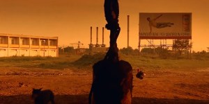 Le Temps des gitans couleur chaude, panneau pancarte inscription, objet au premier plan vue au second, terrain vague