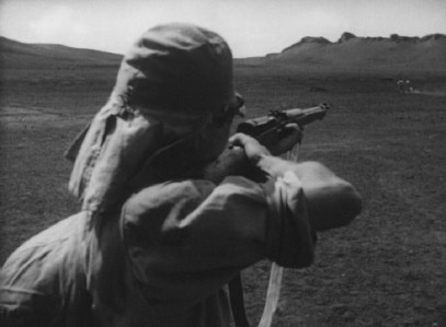 le-deserteur-de-laube-senkichi-taniguchi-1950-akatsuki-no-dasso-shintoho-toho-2 5 octobre 202129 juillet 2025limguela profondeur de champ, désert, casquette, fusil, arme, en joue