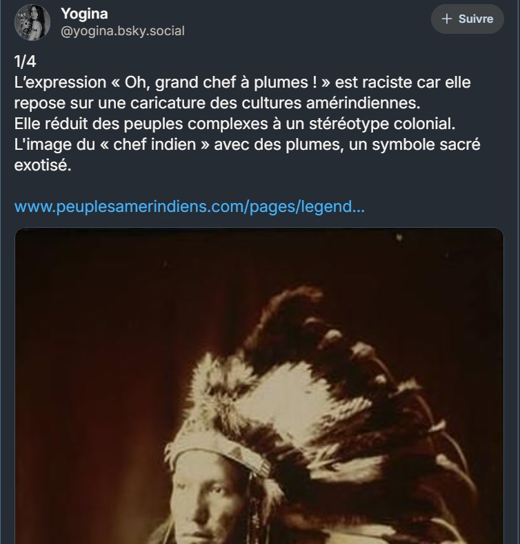 Reste la question de l’appropriation culturelle. Mais là, ma foi, la langue s’organise et évolue toujours par appropriation. Refuser les apports et les références exogènes figeraient et tueraient toutes les langues… La question demeure d’ailleurs la même : l’allusion est-elle péjorative ou méliorative, a-t-elle pour but de marquer une forme de domination ou au contraire de respect ? Je ne vois rien d’offensant dans ces syntagmes. « Grand » « chef » « à plumes ». Pour s’en convaincre, il suffit de chercher quelques occurrences sur google books. L’idiotisme est toujours utilisé comme une hyperbole synonyme de chef imposant. Ainsi, l’anthropologue Ary Gordien écrit dans la conclusion d’un article publié sur theconversation : « L’enjeu principal n’est donc pas de tracer des frontières culturelles imperméables, mais de combattre la reproduction de ces inégalités ou, au moins, d’en limiter le plus possible l’impact ».