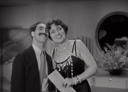 Soupe au canard, Leo McCarey tête contre tête, boucles d’oreille, robe du soir, regard vers le haut, clown