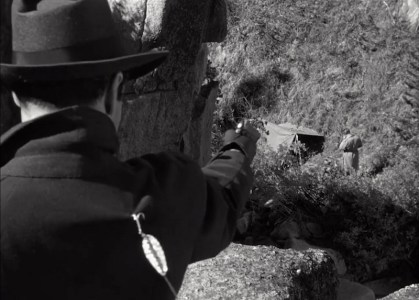 contrechamp, arme, pistolet, deux personnages de dos un au premier plan l’autre au second, rocher, chapeau, pêche, en joue et en garde,