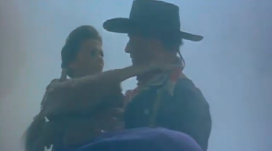 La Prisonnière du désert, John Ford 1956 C.V. Whitney Pictures (1) Deux personnages enlacés, Indiens, costumes militaires, brouillard