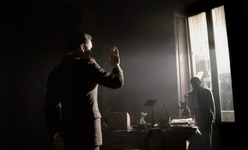 Le Conformiste, Bernardo Bertolucci 1970 Mars Film, Marianne Productions, Maran Film (1) Contre jour, clair obscur, bureau, deux personnages face-à-face en plan américain, fenêtre