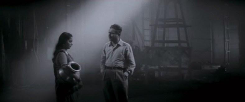 Bon, assez de mièvres pigeons et de gravitation amoureuse. Si l’histoire est attendue, l’exécution, comme déjà dans Assoiffé, frôle le génie. Guru Dutt semble avoir le don de trouver pour chaque plan le mouvement, la distance, le décor, la composition de lumière et de plan, l’axe idéal pour illustrer toujours au mieux son histoire. Même si en 1959 certains de ces effets semblent un peu datés (on sent l’influence toujours du film noir et des grandes fresques romantiques hollywoodiennes comme A Star is Born) on reconnaît la filiation avec Orson Welles. Le jeu des lumières, le choix des lentilles, les postures, les compositions en contre-plongée, le goût pour le mélange des genres, et même une capacité à mêler réalisme et théâtralité (la théâtralité forcément à travers les parties chantées, le jeu, et le réalisme à travers la psychologie des personnages ou le contexte social car malgré les grands écarts que réserve le destin à son héros, Dutt raconte bien une histoire contemporaine, faite à la fois de strass et de crasse). Du grand art donc.