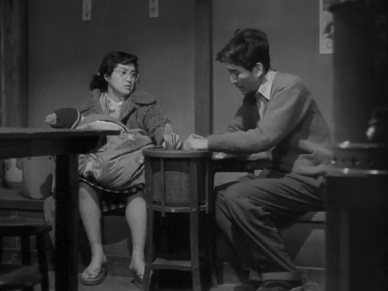 Dans un shomingeki classique, on porte un regard sur les petites gens, mais les choses restent toujours à leur place. Ici, on met un grand coup de pied dans les conventions : le « larbin » chargé de devenir l’exécuteur testamentaire du défunt, avec son petit air idiot trafiqué, on comprend vite ce qu’il convoite. Imaginez que ce que contemple passivement Chishû Ryû, ce ne soit plus le calme, l’immuabilité du monde, mais une parcelle du jardin du voisin. On ne s’assied pas docilement sur le tatemae en contemplant l’humilité des gens simples et en vantant l’ordre établi. Cette fois, le tatemae, tel un masque de kabuki dont Nakamura était maître, soudain se fissure, et derrière le masque des apparences hypocrites, apparaît au grand jour la réalité fourbe d’un personnage qui appartient peut-être à la classe des dominés, mais qui aspire, par la ruse, à prendre la place de ceux qui l’ont méprisé jusque-là. À la limite, le regard porté sur la sœur cadette, présentée comme une jolie idiote, est bien plus bienveillant. Elle a au moins l’excuse de la jeunesse et semble se désintéresser des petits complots que chacun vient à mettre en œuvre pour tirer la couverture à lui.