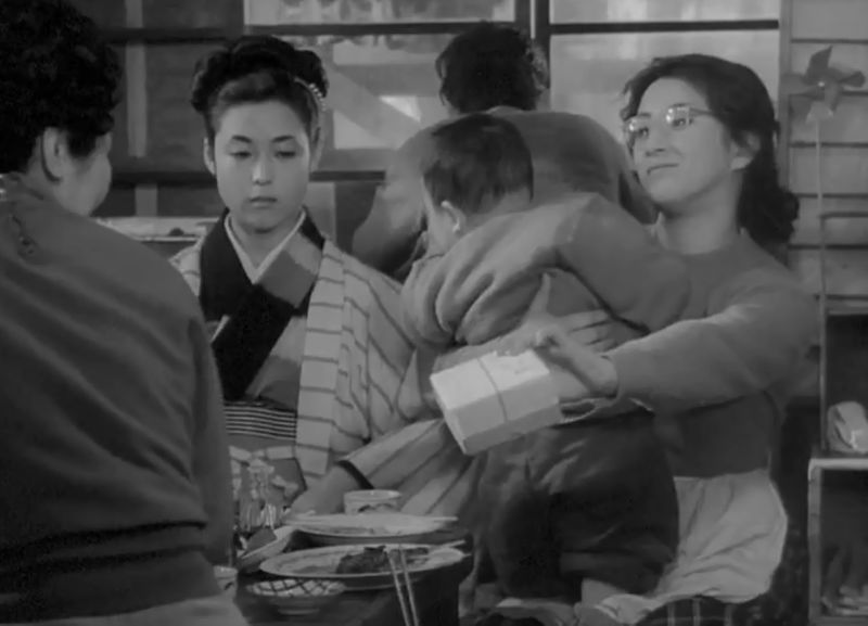 À l’heure où d’ailleurs le shomingeki est passé de mode en 1963, on pourrait presque y voir une forme de shomingeki alternatif en guise de révérence et d’adieu : le regard bienveillant envers les classes populaires, il se fait à la lumière de celui porté, très acerbe, sur la classe dominante. Les remarques immondes et continuelles sur les gens de classe modeste (voire les sœurs entre elles, l’aînée ayant du mal à se faire à l’idée d’être traitée à l’égale de ses cadettes) ne trompent pas. Quelques exemples. Quand les sœurs prennent la résolution de rendre visite à la maîtresse de leur père, l’une d’elles insiste sur la nécessité pour elles d’adopter des habits « simples » de circonstance ; elles s’y rendront finalement en berline de luxe, un sac en croco au bras. Une fois arrivées sur les lieux, l’une des sœurs enlèvera la photo de son frère que la maîtresse des lieux utilisait pour son autel particulier dressé en l’honneur du défunt (plus tard, la sœur déchirera cette photo). Puis, ayant appris que des ennuis de calculs rénaux mettaient en danger sa grossesse, les deux sœurs et la tante exigeront d’abord que l’ancienne « geisha de bains publics » suive un examen gynécologique ; elles insisteront ensuite, dans une séquence d’une rare violence, pour assister à la scène… Un peu avant ça, quand l’une des filles se rend dans les habitations délabrées que la famille loue pour s’enquérir du prix que cela pourrait valoir, les locataires s’étonnent de voir débarquer à l’improviste « le propriétaire » qui manifestement néglige depuis longtemps leurs demandes et laisse dépérir les lieux. La critique est frontale, parfois plus fugace, mais toujours violente. Au moins sur l’aspect « lutte des classes », l’accumulation des critiques acides laisse peu de doutes quant aux intentions de l’auteure.