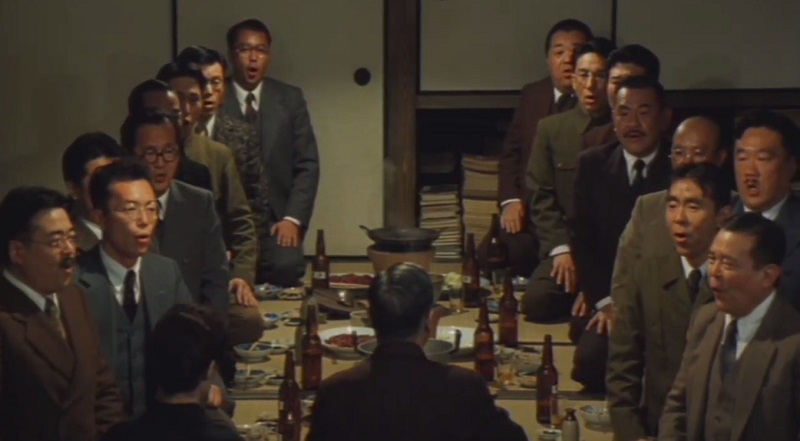 Un art dans lequel Misumi est maître (il laisse peut-être ses directeurs de la photo régler et définir les cadres, mais on retrouve certains tics de découpage comme l’usage des plans rapprochés en début de séquence qui ne trompent pas). Un plan rapproché en introduction donc, permet d’illustrer une situation en entrant presque symboliquement dans le sujet de la scène (comme je l’ai précisé ailleurs, c’est un moyen de jouer par énigme et d’attirer l’attention en faisant précéder les effets aux causes). Misumi élargit ensuite, use de montage alterné si c’est possible, à défaut, de champ-contrechamps (voire de montage-séquences) ; et il fait ainsi dialoguer toutes les ressources disponibles que le cinéma a inventées pour introduire des éléments dont on ne comprend pas forcément dans un premier temps la nature et dans quel cadre et dans quel contexte ils évoluent. Cela a une vertu : quand le spectateur picore ainsi des indices, il cherche à comprendre, son attention est toujours en alerte, et il ne lui faut pas attendre longtemps pour avoir la satisfaction d’avoir bientôt une vue plus large qui donne une meilleure idée de la situation — une forme de suspense permanent en somme.