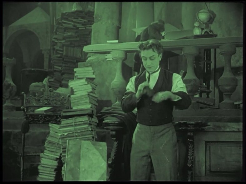 Une idée des décors intérieurs (probablement dirigés par Alberto Cavalcanti donc, qui tourne la même année son premier, Rien que les heures, et qui sera quelques années plus tard un exilé prolifique outre-manche) qui, en plongée dans cette bibliothèque n’est pas sans rappeler une image bien connue du « plus grand film de l’histoire » :
