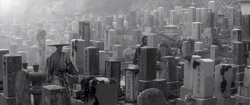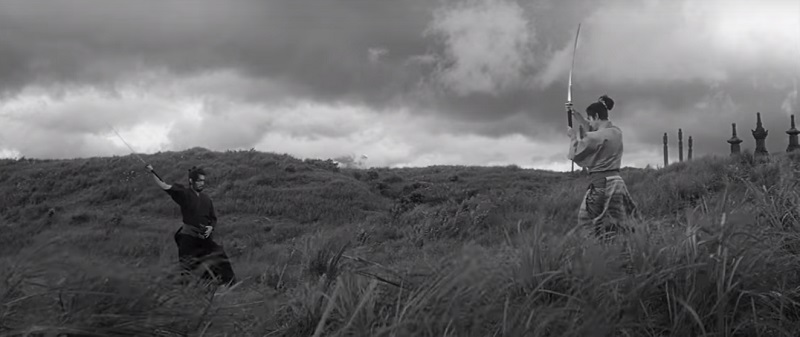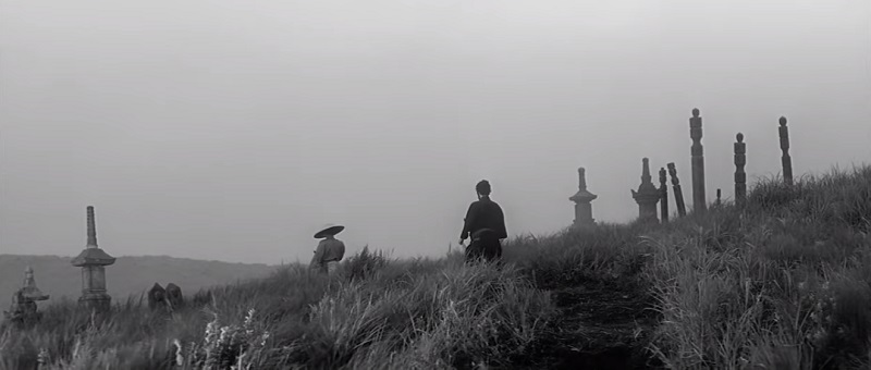 La mise en scène de Kobayashi alterne les rythmes. On est presque chez Sergio Leone avec des temps d’appesantissement, de suspension, où les personnages se jaugent, s’épient ; puis tout à coup un jaillissement. Le noir et blanc est magnifique (voir les captures du duel plus bas), tout comme les décors. Tout contribue à une utilisation parfaite de l’écran, à travers notamment le jeu des contrastes. Les mouvements de caméra ponctuent souvent le récit au début d’une scène. C’est magnifique, sauf quand on a droit à des panoramiques un peu trop prononcés avec un grand-angle…, là, ça donne un peu la gerbe. Bien mieux que Rébellionen tout cas…