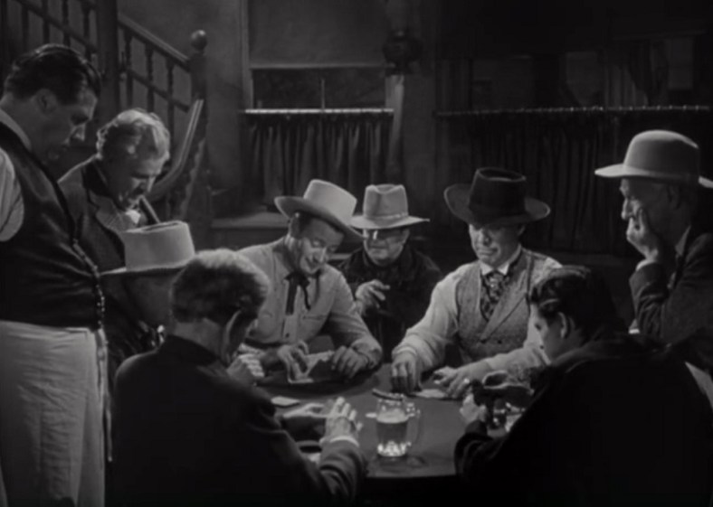 Johnny Guitare : Vous m’offrez cette cigarette ?… (à l’autre camp :) Auriez-vous du feu, ami ? Rien ne vaut une cigarette et une tasse de café. Certains sont obsédés par l’or et l’argent. Pour d’autres, c’est les terres et le bétail. Et il y a ceux qui ont un faible pour le whisky et les femmes. Mais au fond, de quoi un homme a-t-il besoin ? D’une cigarette et d’un café.